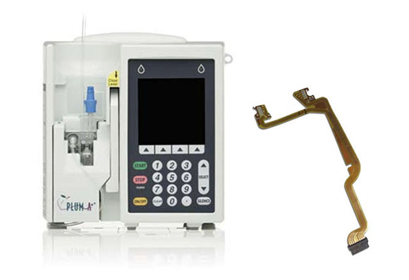 A medical infusion pump used to administer medications to patients via IV which utilizes a flexible printed circuit to interconnect two pressure monitoring strain gauges to control fluid pressure.